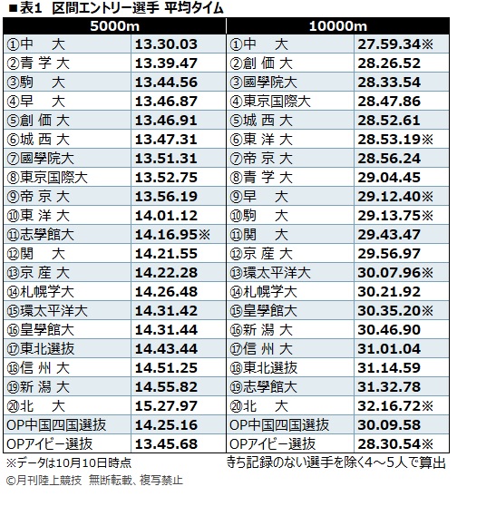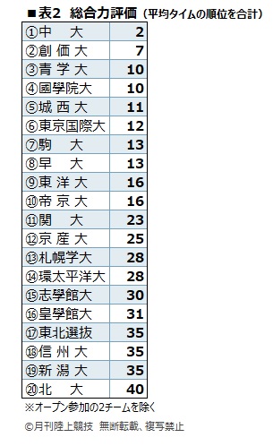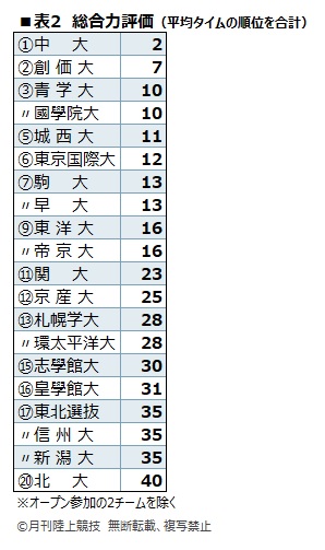 出場全22チームのエントリー6人の5000mと10000mの平均タイムをまとめたのが表1だ。表1の2種目の平均タイムの順位を足して、「総合力評価」としたのが表2。関東勢が上位を固め、関大や京産大の関西勢が追う構図は変わらない。
