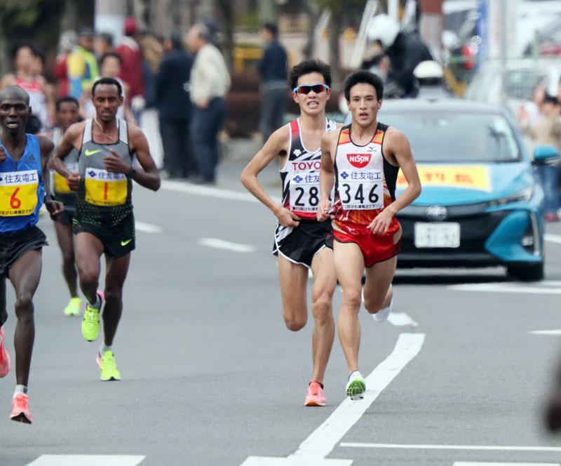2017年3月のびわ湖毎日でマラソンに初挑戦した村澤(右端)。中盤まで先頭集団に食らいついたが、35km過ぎから失速して28位(2時間17分51秒)。しかし、半年後の北海道マラソンに優勝(2時間14分48秒)して2019年9月のMGC出場権獲得の第1号となった