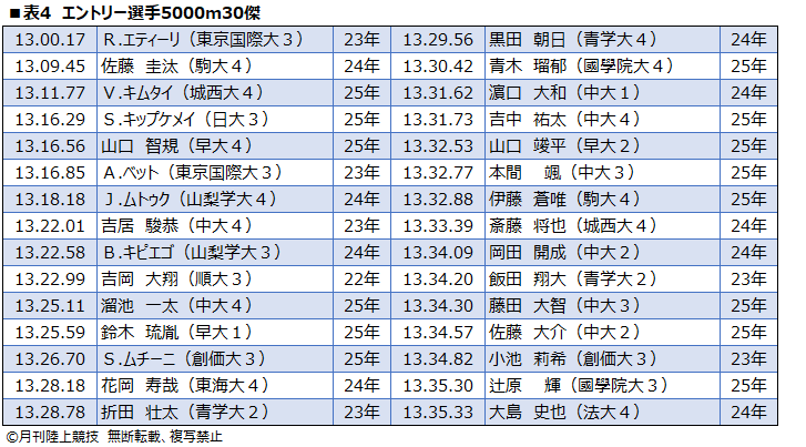 ■表4 エントリー選手5000m30傑[/caption]