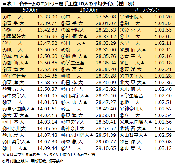 ■表1 エントリー選手上位10人の5000m、10000m、ハーフマラソンの平均タイム[/caption]