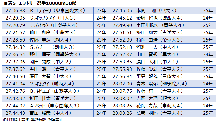■表5 エントリー選手10000m30傑[/caption]