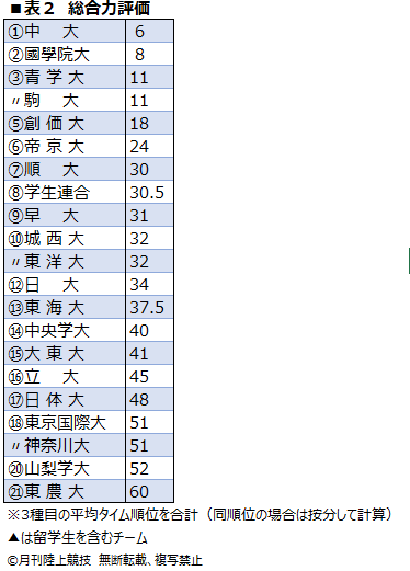 ハーフマラソン部門では國學院大が1時間1分20秒で1位。駒大、帝京大までが平均で1時間1分台に突入し、中大が4位、早大が5位と続いている。そして、各部門の順位を合算して総合力評価としたのが、表2。スピードに勝る中大がトップにつけ、ハーフで順位を上げた國學院大が2位、
