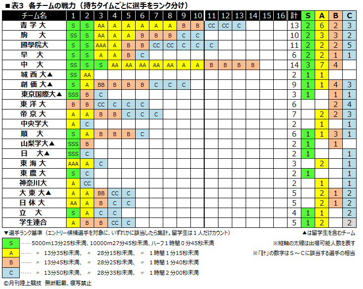 さらにエントリー選手を独自の基準でランク分けし、戦力分布としてまとめたのが表3だ。ランクづけで選手層の面では中大が14人、青学大が13人で争い、國學院大が11人、駒大が10人、創価大が9人で続く。エース格の選手を示すSランクでは中大が3人、青学大、駒大、國學院大、早大が2人となっている。