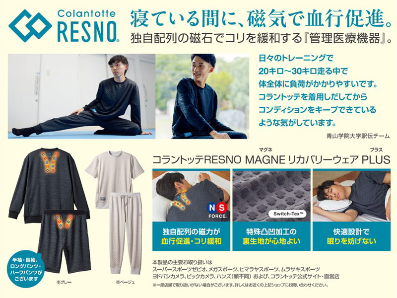 休養にはマッサージや治療などさまざまあるが、そのなかでも日々の〝睡眠〟も欠かせない要素。それをサポートしているのが『コラントッテRESNO MAGNE リカバリーウェア PLUS』だ。
