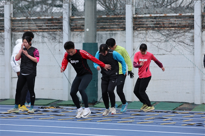 陸上の走りにつながる意識を持って行うように指導。どのメニューでも、「軸」「力の発揮」「接地」など、基礎的な感覚を大切にしている。